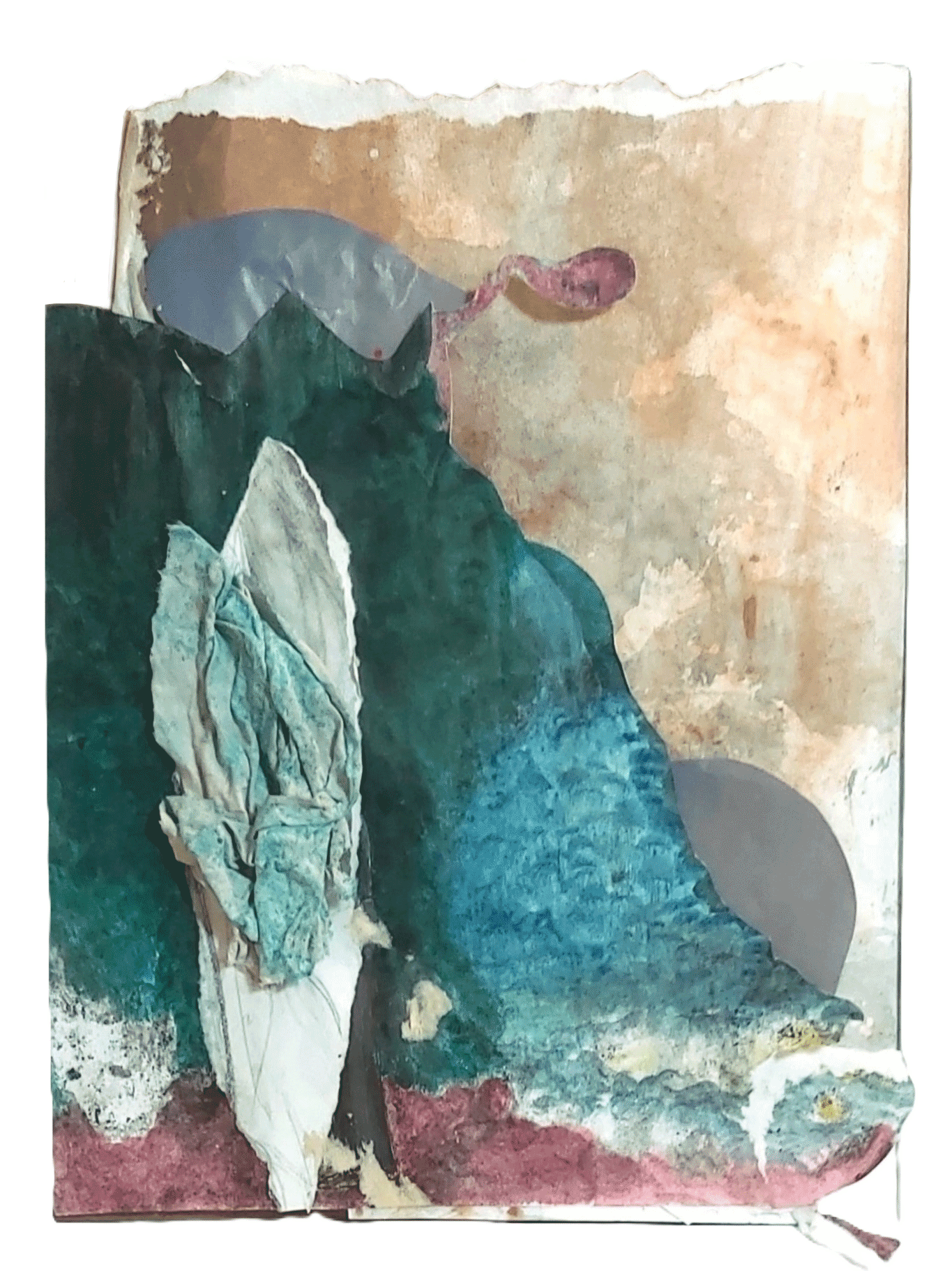 Marais, 2025. Collage, technique mixte, acrylique, tissu enduit de farine d'amidon, barbotine et argile sur papier, Dim 28x38 cm